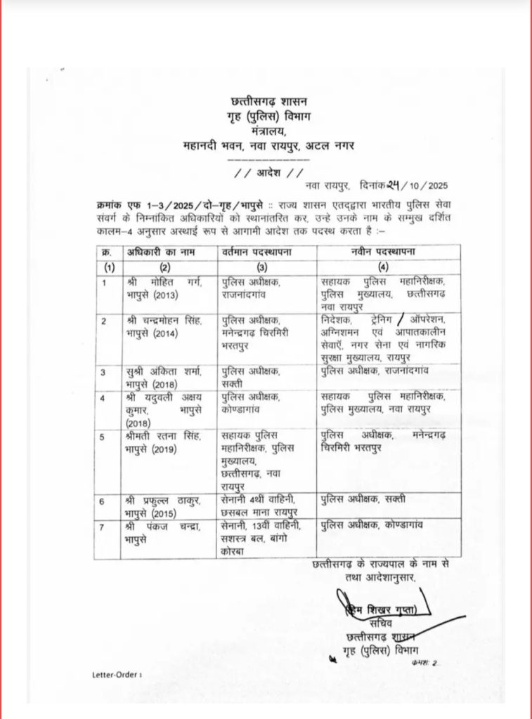 जारी किए गए आदेश में वर्तमान में शक्ति जिले की एसपी अंकिता शर्मा को राजनंदगांव का नया एसपी बनाया गया है । वही रतन सिंह को महेंद्रगढ़ का एसपी बनाया गया है । प्रफुल्ल ठाकुर को अंकित शर्मा की जगह शक्ति जिले का एसपी बनाया गया है । पंकज चंद्र को कोंडागांव जिले का नया प्रभार दिया गया है । गृह विभाग द्वारा यह जारी आदेश संभवतह कानून व्यवस्था को और मजबूत करने के दृष्टिकोण से करना बताया जा रहा है आदेश जारी होते ही सभी अधिकारियों को नई पद स्थापना वाले जगह पर तत्काल कार्यभार संभालने के निर्देश जारी किए गए हैं पुलिस विभाग में प्रदेश में कानून व्यवस्था में सुधार लाने यह बदलाव किया गया है ऐसा बताया जा रहा है।