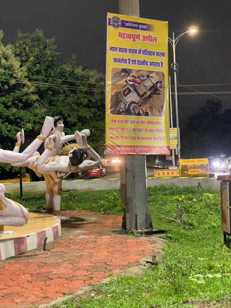 ऑपरेशन सुरक्षा के तहत यातायात पुलिस दुर्ग द्वारा नागरिकों को सुरक्षित यातायात के लिए प्रेरित करने हेतु शहरभर में व्यापक जागरूकता अभियान चलाया जा रहा है। इसी क्रम में सेंट्रल एवेन्यू रोड, भिलाई स्थित प्रमुख चौक-चौराहों पर ड्रिंक एंड ड्राइव न करने, ओवरस्पीडिंग से बचने, हेलमेट अनिवार्य रूप से पहनने जैसे संदेशों वाले बैनर एवं पोस्टर लगाए गए हैं। इनका उद्देश्य आम नागरिकों में सड़क सुरक्षा के प्रति व्यवहारिक बदलाव लाना है।